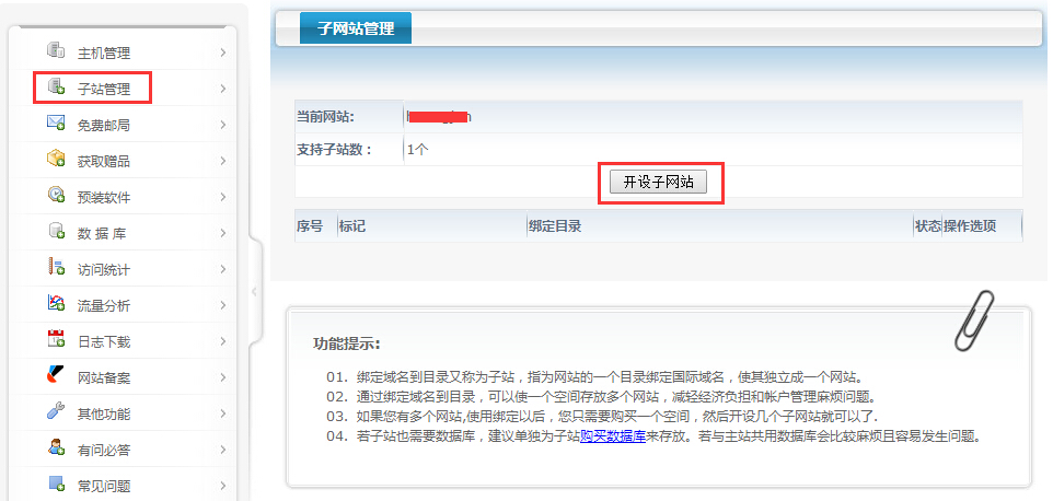 虛擬主機(jī)子站功能開設(shè)子網(wǎng)站流程第一步:先到wwwroot目錄新建一個(gè)目錄。 第二步:到管理中心,業(yè)務(wù)管理--虛擬主機(jī)管理--管理 進(jìn)入到主機(jī)管理,點(diǎn)擊子站管理