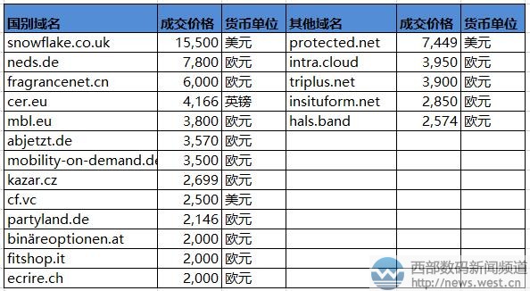 國(guó)別域名方面,英國(guó)域名snowflake.co.uk以15,500美元成交,約合人民幣10萬(wàn)元。域名Snowflake.co.uk雖然字符較長(zhǎng),后綴又是長(zhǎng)尾域名,但勝在含義通用。前綴snowflake是“雪花”的意思,在全球都是比較常用的詞,加上沒(méi)有特別的行業(yè)趨向性,所以應(yīng)用空間廣泛,市場(chǎng)價(jià)值不錯(cuò)。 其他域名方面,protected.net(保護(hù))以7,449歐元結(jié)拍,約合人民幣5.7萬(wàn)元。另外,兩個(gè)新頂級(jí)域名intra.cloud(內(nèi)部云)和hals.band(柏林住房)分別以3950和2574歐元的成交價(jià)上榜。 本文轉(zhuǎn)載自新聞資訊,原文鏈接:“禮物”域名12萬(wàn)元領(lǐng)銜!韓國(guó)最大比特幣交易所買(mǎi)走korbit.com?