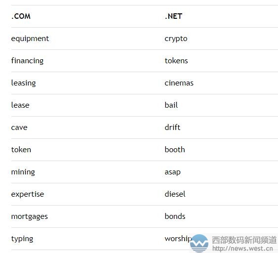 .com方面,“equipment”(設(shè)備,器材、配件)力壓眾多關(guān)鍵詞一舉成為最受歡迎的.com域名注冊詞匯。Equipment除了對應(yīng)有知名法國服飾品牌以外,本身還可以與多個行業(yè)多諸多詞語組合,可應(yīng)用的領(lǐng)域非常廣。 隨后是“financing”(融資、理財),作為一個金融類詞語,與此相關(guān)的域名可用來搭建投資理財?shù)冉K端平臺。同樣屬于金融行業(yè)詞的還有 “mortages”(抵押貸款),相關(guān)域名用來搭建抵押借貸平臺比較合適。 另外,兩個有著“租賃”之意的詞語“l(fā)easing”和“l(fā)ease”也成為6月份的注冊熱詞,可用于汽車、房產(chǎn)等多個行業(yè)租賃平臺。除此以外,“token”(代幣)、“mining”(采礦)、“cave”(洞穴)、“typing”(打字)均成為6月熱門注冊詞匯。 .net方面,兩個虛擬貨幣類詞語“crypto”(加密貨幣)、“token”(代幣)是6月最受歡迎的注冊詞匯。今年以來,虛擬貨幣行業(yè)的瘋狂發(fā)展,不僅使得相關(guān)域名成交價水漲船高,也催生了大批域名淵源不斷的被注冊。 隨后,“cinemas”(電影院)一詞在本月注冊量也極大,近年來,全球影視市場風(fēng)起云涌,不少大佬紛紛進(jìn)軍電影領(lǐng)域,加上今年大片不斷,“電影院”人氣高漲。 除此以外,“bail”(保釋金)、“drift”(漂泊)、“booth”(售貨棚)等詞也榜上有名。 本文轉(zhuǎn)載自新聞資訊,原文鏈接:威瑞信6月月報:虛擬貨幣熱度不減!“crypto”再成最受歡迎域名關(guān)鍵詞