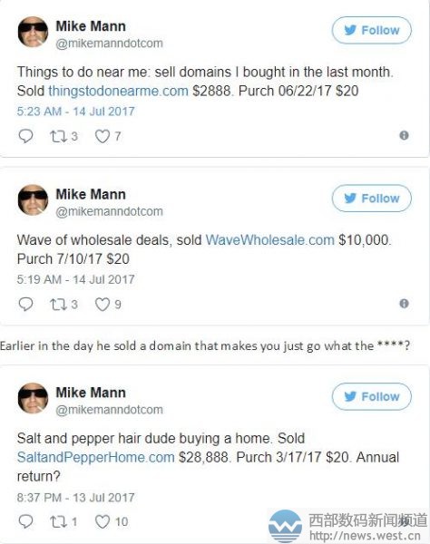 4天獲利500倍!論域名玩得溜,我只服Mike Mann三五互聯(lián)(35.com)7月14日消息,說真的,小編每次報道Mike Mann的交易消息時,內(nèi)心都有止不住的羨慕嫉妒恨。尤其是今天這幾個域名的交易,小編真的有一種“老大爺?shù)沽硕疾环觥保ú灰?dāng)真),就服Mike Mann。