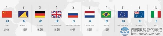 國別域名方面,截止到2017年第一季度末,注冊總量為1.431億個,環(huán)比增長03.%,同比增長1.7%。其中,中國國家域名.cn注冊量突破2000萬,達到2140萬,是全球注冊量最大的國別域名。緊隨其后的是南太平洋島國.tk域名,注冊量為1860萬。接著是德國國家域名.de以及英國國家域名.uk。