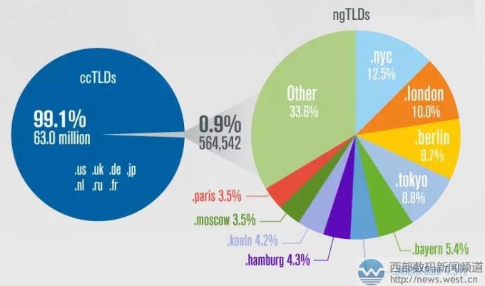 地區(qū)域名方面,截至到今年3月31日,共有37個地區(qū)域名,注冊總量為564,542,占全球域名注冊總量的0.9%。其中,.nyc域名是目前為止注冊量最大的地區(qū)域名,隨后是.london和berlin域名。