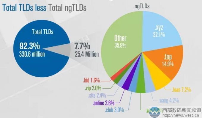 截至到今年3月31日,新頂級域名全球注冊量總量達2540萬,占全球域名注冊總量的7.7%。而排名前10的新頂級域名注冊量又占全球新頂級域名注冊總量的64.1%。其中,排名第一的是.xyz域名,占新頂級域名注冊總量的22.1%,隨后是.top域名,占全球新頂級域名注冊總量的14.9%,.loan域名.wang域名以及.win域名分別次之。