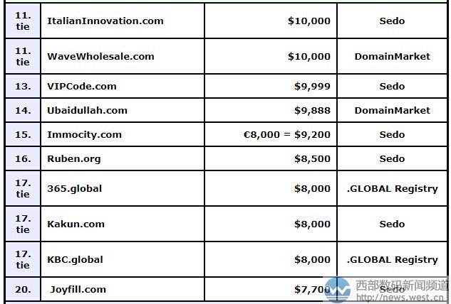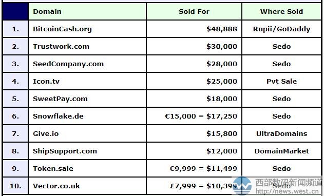 據(jù)whois信息顯示,域名bitcoincash.org于今年3月份手工注冊,雖然注冊時間很短,但由于其“比特幣現(xiàn)金”的含義迎合了今年上半年高歌猛進的虛擬貨幣尤其是比特幣的發(fā)展,所以這類域名的市場價值隨著水漲船高,bitcoincash.org能賣出33萬元的價格也是情理之中。 隨后是以30,000美元在sedo平臺成交的域名trustwork.com,約合人民幣20萬元,有“信任工作”的意思。目前對應新西蘭云管理軟件trustworks.co.nz、全球性環(huán)保企業(yè)trustworksglobal等。而購買域名trustwork.com的是一家新興科技發(fā)展企業(yè)Trustwork。 緊隨其后的是以28,000美元結(jié)拍的英文組合域名seedcompany.com,約合人民幣19萬元。該域名直譯為“種子公司”,對應有服飾品牌Seed Heritage、機動戰(zhàn)士高達SEED動畫以及一款名為seed的社交閱讀應用。該域名盡管目前尚未啟用,不過whois顯示已經(jīng)綁定至服務器了,不久將建站上線。 本期榜單的第五名則是私下成交的icon.tv,成交價為25,000美元,約合人民幣16.9萬元。Icon是“偶像、崇拜”的意思,.tv原是太平洋島國圖瓦盧的國家域名,后多用在視頻、直播類領域。組合在一起,域名icon.tv很適合搭建偶像直播平臺。 本期榜單排名前10的域名中,國別域名還有德國域名snowflake.de(雪花),成交價為15,000美元,約合人民幣11.5萬元;英屬印度洋領地域名give.io(給予),成交價為15,800美元,約合人民幣10萬元;以及英國國家域名vector.co.uk(矢量、航向)也以五位數(shù)美元成交。 除此以外,本期一枚新頂級域名token.sale也以11,499美元的價格躋身前10,約合人民幣8萬元。token.sale有“代幣銷售”的意思,很適合搭建虛擬貨幣電商類平臺。另外,其他域名也有不錯表現(xiàn),交易詳見下圖: 本文轉(zhuǎn)載自新聞資訊,原文鏈接:DN榜:比特幣風頭太盛!3月注冊的域名bitcoincash.org賣出 6位數(shù)!