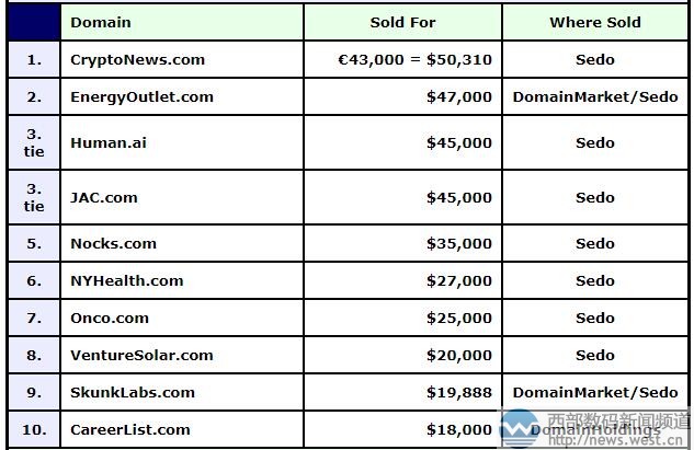域名cryptonews.com注冊于1999年,主體由crypto和news組合而成,具有“加密消息”的意思,用來搭建網(wǎng)絡(luò)安全平臺比較合適。另外,今年以來加密貨幣(CryptoCurrency)等虛擬貨幣行情不錯,Crypto news也可指代加密貨幣方面的新聞,用來搭建相關(guān)資訊平臺也很合適。據(jù)查詢發(fā)現(xiàn),相關(guān)域名cryptonews.biz/.org目前均已建站。 排名第二的是域名energyoutlet.com,成交價為47,000美元,約合人民幣31萬元。該域名由英文單詞“energy”(能源)和“Outlet”(出口、批發(fā))組合而成,適合用于能源相關(guān)領(lǐng)域名。 本期DN榜上,國別域名human.ai表現(xiàn)不錯,以45,000美元的成交價躋身三強。.ai后綴原是烏拉圭國別域名,但因其與人工智能(Artificial Intelligence)相對應,后多用于人工智能領(lǐng)域。域名human.ai代表有“人、人類”的意思,是很常見的英語詞匯,用來搭建人工智能相關(guān)平臺價值不錯。 與Human.ai并列第三的還有三字母域名jac.com,該域名注冊于1995年3月,在中文里有“聚愛財”的含義,非常適合搭建金融理財平臺。除此以外,jac.com還對應有不少終端,比如jac江淮汽車(jac.com.cn)、JAC外貿(mào)實戰(zhàn)博客(jacindustry.org)、JAC服裝品牌設(shè)計(jacline.cn)等等。 除此以外,因為域名nocks.com(作凹痕于、箭扣)以35,000美元成交;組合域名nyhealth.com(紐約健康)以27,000美元成交;onco.com(致癌)成交價為25,000美元。其他域名也有不錯表現(xiàn),交易詳見下圖: