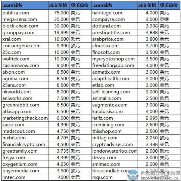 域名publica.com具有“國民”的意思,該域名注冊(cè)于1996年,距今已有22年歷史了。從含義上說,publica.com比較適合搭建公益類項(xiàng)目或者創(chuàng)意平臺(tái)。搜索發(fā)現(xiàn),目前就有新西蘭創(chuàng)意設(shè)計(jì)代理商publica與之對(duì)應(yīng),官網(wǎng)啟用域名publica.co.nz,另外海外出版經(jīng)濟(jì)電子商務(wù)平臺(tái)Publica也與之對(duì)應(yīng)。 排名第二的是組合域名Mega-Sena.com,成交價(jià)為35,000美元,約合人民幣23萬元,該域名直譯為“萬塞納”,對(duì)應(yīng)有巴西一個(gè)樂透彩票網(wǎng)。同樣為扁擔(dān)域名的block-chain.com,成交價(jià)為30,000,是“區(qū)塊鏈”的意思,對(duì)應(yīng)有當(dāng)下火熱的區(qū)塊鏈行業(yè),具有不錯(cuò)的商業(yè)價(jià)值。 隨后是一枚“支付”類域名grouppay.com,成交價(jià)為19,999美元,約合人民幣13萬元。該域名有“集團(tuán)支付”的意思,目前已被一家名為GroupPay Inc的公司收購并啟用建站。 接下來超五位數(shù)美元成交的還有域名xrai.com,成交價(jià)為10,000歐元,該域名中含有字母“AI”,有“人工智能”之意,也是當(dāng)前的熱門行業(yè)。另外,25c.com和wolftek.com都拍了1萬美元,“門房”域名conciergerie.com拍了9990歐元,潛在終端是巴黎裁判所附屬監(jiān)獄。
