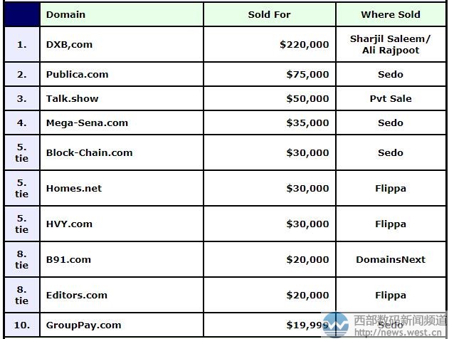 來(lái)源三五互聯(lián)新聞資訊:域名DXB.COM以143萬(wàn)元領(lǐng)跑DN榜!新頂級(jí)六位數(shù)成交引關(guān)注