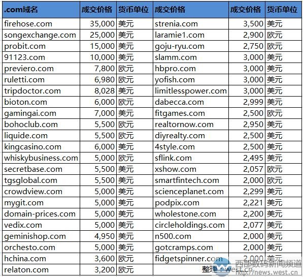 按照慣例,我們還是先來看.com域名。本期sedo榜上,成交價(jià)最高的com域名來自英文域名firehose.com,交易價(jià)為35,000美元,約合人民幣27萬(wàn)元。該域名屬于行業(yè)詞匯,直譯為“消防水帶”,目前對(duì)應(yīng)有前端開發(fā)公程師培訓(xùn)平臺(tái)Firehose Project,官網(wǎng)域名為thefirehoseproject.com。 緊隨其后的也是一枚英文組合域名songexchange.com,該域名由“song”(歌曲)和exchange(切換)組合而成,成交價(jià)為25,000美元,約合人民幣19萬(wàn)元,很適合搭建音樂類軟件平臺(tái)。 除此以外,域名probit.com和91123.com分別以15,000美元和10,000美元成交。前者對(duì)應(yīng)一種廣義上的線性模型——probit模型;后者是五數(shù)字域名,屬于硬通貨,在建站方面沒有限制。