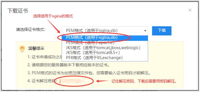 3.選擇PEM格式,適合nginx的,然后點擊下載。因為下載是rar的壓縮包,因此請記住解壓密碼,下載后需要用密碼進行解壓。