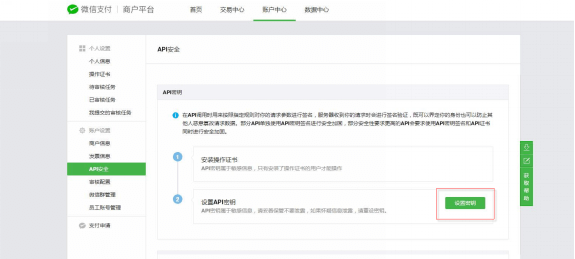 2.2 商家密鑰點擊“賬戶中心”->“API安全”菜單,設(shè)置32位密鑰并記錄備份,如下圖示; 注意:密鑰填寫錯誤會導(dǎo)致支付異常,如期間修改請重新登錄商城后臺同步修改參數(shù)。
