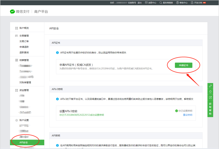 2.3 獲取API證書注意:請務(wù)必按照操作流程去下載證書,期間請不要關(guān)閉工具等相關(guān)程序,如生成了證書關(guān)閉工具的話,會導(dǎo)致證書無法下載,只能等48小時之后重新生成。(證書一年只能生成3次,下載后請保存好) 一、如何判定證書類型為【權(quán)威CA頒發(fā)的API證書】登錄微信支付商戶平臺點擊APT安全,出現(xiàn)如下圖所示則為權(quán)威CA頒發(fā)的API證書