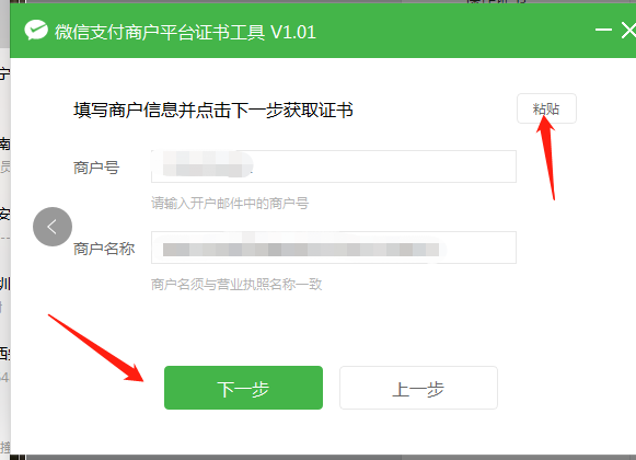 4、復(fù)制好商戶號和商戶名稱點擊切換至【證書工具】,點擊右上角的【粘帖】按鈕,將先前復(fù)制的商戶號和商戶名稱粘帖到證書工具中,然后點擊【下一步】
