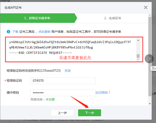 6、在證書工具里復(fù)制的證書串點后返回【微信支付商戶平臺】,將復(fù)制的證書請求串粘貼至生成aid證書的頁面,并輸入短信驗證碼及操作密碼,點擊下一步