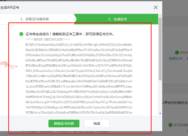 7、點擊下一步后會生成證書串【此時系統(tǒng)將認(rèn)為申請證書成功】點擊【復(fù)制證書內(nèi)容】