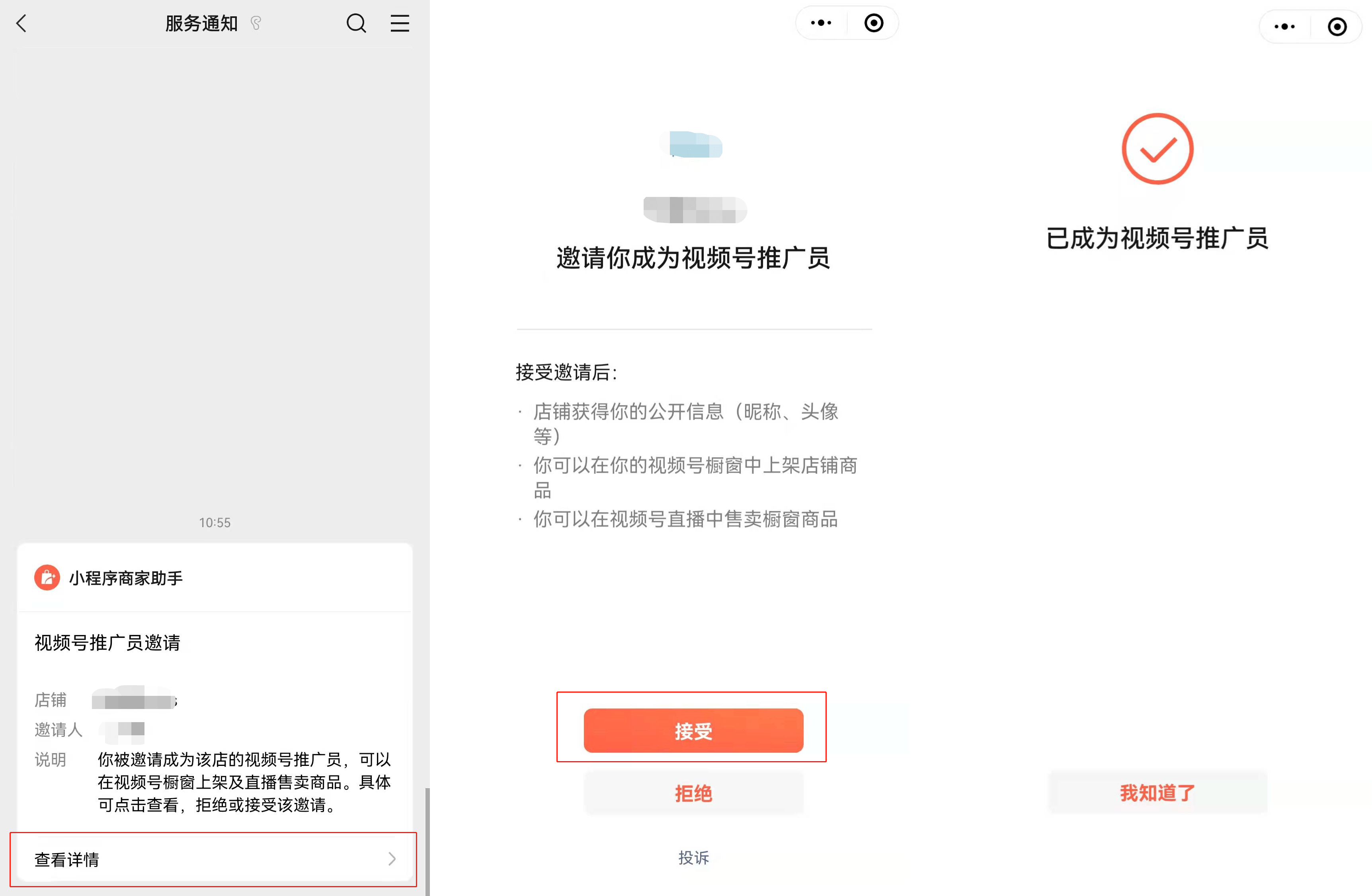 8、推廣員的微信將收到服務(wù)通知推送的視頻號推廣員邀請,點擊【查看詳情】,點擊【接受】,成功成為視頻號推廣員