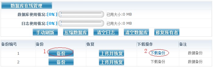 3、mssql數(shù)據(jù)庫備份(若沒有sqlserver數(shù)據(jù)庫請?zhí)^) 登錄我司網(wǎng)站,點(diǎn)擊“業(yè)務(wù)管理”——“mssql數(shù)據(jù)庫”——“管理”,進(jìn)入數(shù)據(jù)庫在線管理,點(diǎn)擊“備份”按鈕將數(shù)據(jù)庫備份為bak文件,再點(diǎn)擊“下載備份”,可以將備份文件下載到您本地或服務(wù)器。如圖: