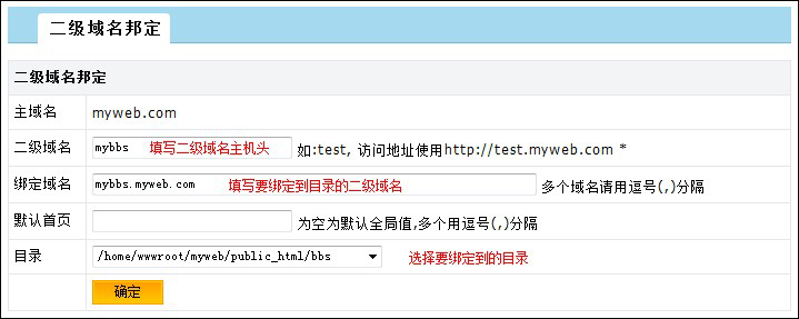 二級域名:填寫主機頭就可以了,比如要用mybbs.myweb.com來訪問,二級域名那填寫mybbs 綁定域名:填寫完整的要訪問的域名,如要用mybbs.myweb.com訪問就填寫mybbs.myweb.com,不用加http:// 默認首頁:保持默認 目錄選擇:選擇需要綁定到的子目錄,這里我們選擇bbs目錄測試。如圖:
