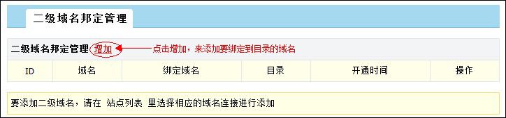 在“二級域名綁定管理”中,點擊“增加”,如圖: