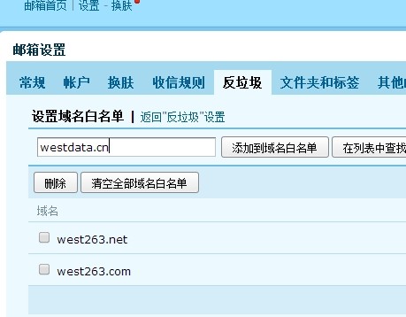2.在 反垃圾郵件--白名單--設(shè)置域名白名單 3.添加域名35.net 到白名單里面保存 (我們的發(fā)件地址為 noreply***@35.net )
