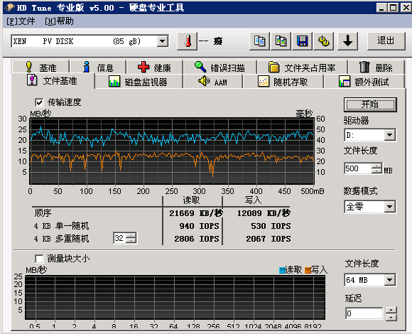 隨機讀寫性能也是衡量硬盤表現(xiàn)的重要指標(biāo),它基本上代表了硬盤在讀寫散布在各個位置的小文件時的性能表現(xiàn),一般以4KB文件大小為標(biāo)準(zhǔn),IOPS(I/Os per second)即每秒輸入輸出次數(shù)。 在網(wǎng)站W(wǎng)EB應(yīng)用及數(shù)據(jù)庫應(yīng)用中,通常是若干隨機小文件的讀寫,故存儲的IOPS若太低則在高訪問量的情況下可能會成為性能瓶頸。 用“HD Tune專業(yè)版5.50”中的“文件基準(zhǔn)”功能可以測試 IOPS性能,一般以4K大小對應(yīng)的iops指標(biāo)做為參考: